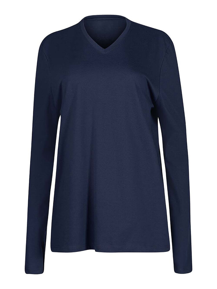 Het HUBER Hautnah Night Basic Selection T-shirt in donkerblauw overtuigt door zijn relaxte pasvorm en uitzonderlijke comfort. De zachte jerseystof van 100% katoen biedt een ademend en aangenaam gevoel op de huid. Met zijn V-hals, lange mouwen en regular fit is dit shirt ideaal als slaap- of vrijetijdstop. Het is bovendien machinewasbaar en gemakkelijk te strijken.