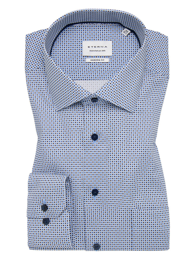 Het moderne business overhemd uit de ETERNA Modern Fit collectie staat voor de zelfverzekerde en modieuze man van vandaag. Een eigentijdse snit in combinatie met eersteklas productdetails belooft een hoog draagcomfort, waardoor dit overhemd een meester in rangschikking is. Het gedessineerde overhemd in de kleur lichtblauw overhemd voor heren mag in geen enkele mannengarderobe ontbreken en kan met de stijlvolle en klassieke Kent kraag zowel voor elke gelegenheid als in het dagelijks leven worden gedragen. Dit ETERNA Modern Fit herenoverhemd komt het beste tot zijn recht met een bijpassende stropdas en een brede dasknoop.