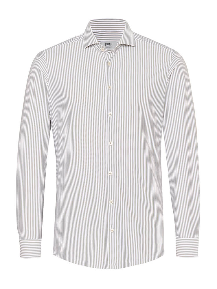 Het elegante jersey overhemd uit de PURE Functional collectie staat voor de slanke, modebewuste man van vandaag. Een slanke pasvorm gecombineerd met modieuze details beloven een hoog draagcomfort en maken van dit overhemd een combinatiekunstenaar. Het gestreepte overhemd in de kleur grijs mag in geen enkele mannengarderobe ontbreken en kan met de elegante en tijdloze Cutaway kraag zowel voor elke gelegenheid als in het dagelijks leven worden gedragen. Dit PURE Functional herenoverhemd komt het beste tot zijn recht met een smalle stropdas en een kleine dasknoop.Fabrikantgegevens: