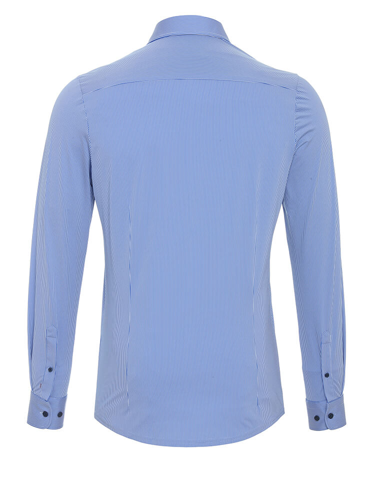 Het elegante jersey overhemd uit de PURE Functional collectie staat voor de slanke, modebewuste man van vandaag. Een slanke pasvorm gecombineerd met modieuze details beloven een hoog draagcomfort en maken van dit overhemd een combinatiekunstenaar. Het gestreepte overhemd in de kleur middenblauw mag in geen enkele mannengarderobe ontbreken en kan met de elegante en tijdloze Cutaway kraag zowel voor elke gelegenheid als in het dagelijks leven worden gedragen. Dit PURE Functional herenoverhemd komt het beste tot zijn recht met een smalle stropdas en een kleine dasknoop.Fabrikantgegevens: